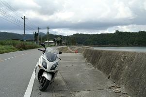 「う〜ん、暑い!」 ってことで、出発前に水をザバッとかぶって、気合一発でGO!🛵💨 走り出した瞬間、風が身体に当たってめちゃくちゃ涼しい〜! この爽快感がたまらないんだよね! 最初の20kmくらいは、その涼しさをバッチリキープして快走できたんだけど… そこへキターッ! 恵みのスコールだ!☔️✨ これがまたちょうど良い涼しさを連れてきてくれて、超〜快適に走れちゃう!もう、天然のシャワーみたい!🚿 今回の南下中、5回くらいスコールに降られたかな? 雨粒がめっちゃ大きいから、ヘルメットやシールドに**「カン!カン!」って当たる音が響くんだ!それもまた沖縄ライドならではのBGM**って感じ!🎶 そして、一瞬の晴れ間を見計らって、すかさずパシャリ!📸 きっと、最高にドラマチックな写真が撮れたんじゃないかな!