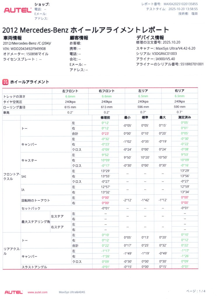 ホイールアライメント調整とATF交換が完了しました。ハンドルのセンターがしっかりと出て、気持ちよく走れるようになりました。能登半島地震の影響でアライメントがずれてしまっていました。きちんと整備して長く乗りたいと思います。