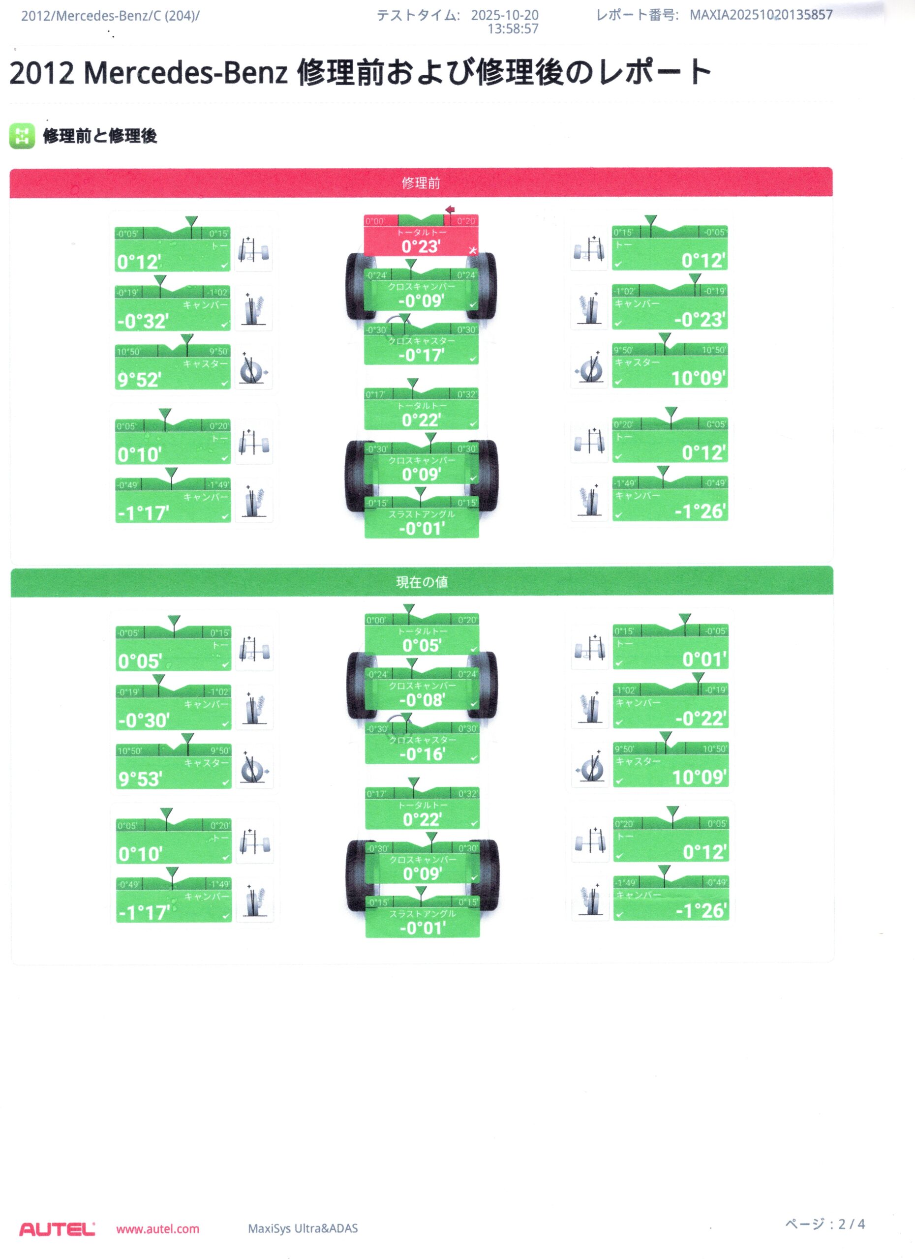 アライメントが適正でないと、カーブを曲がる際にスムーズに曲がれなかったり、ハンドルの応答性が悪くなったりします。調整後は、軽快で正確なハンドリングが蘇り、運転の楽しさも増します。